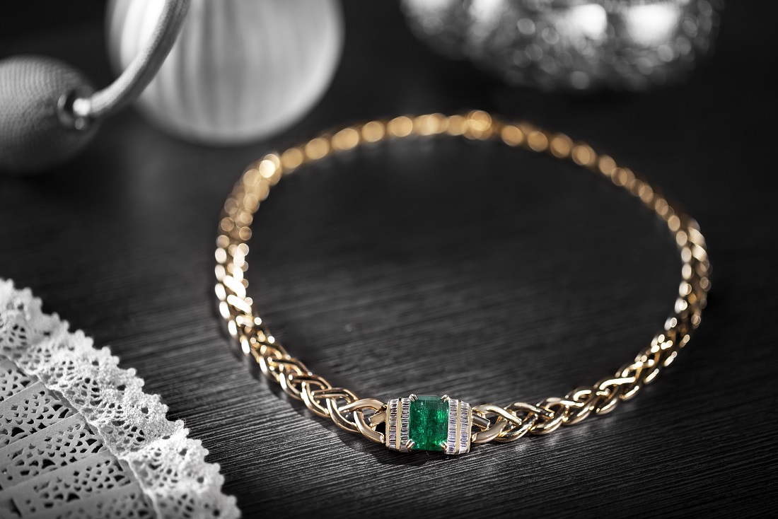 Anita Page defined the glamour of the 1920s with her braided hair and flapper dresses. Inspired by her iconic braids, this gold necklace from Zoya’s 6299 Hollywood Blvd collection, in yellow and white gold, lined with glistening diamond baguettes, romances a glorious, 9-carat emerald. The braids are technically mastered for flexibility, so the stunning necklace drapes with fluidity around the neck.