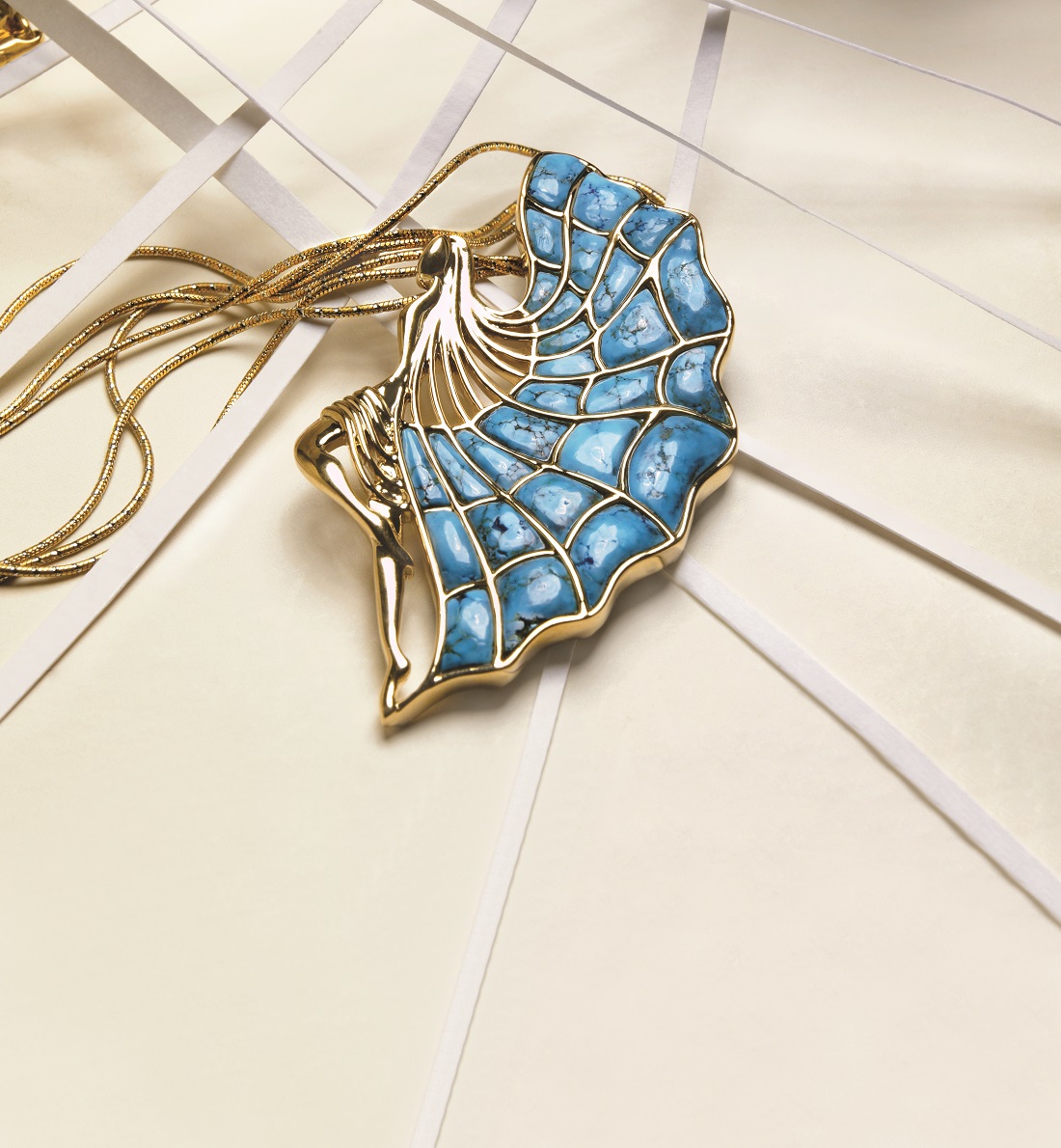 Arachne is inspired by the Greek legend of the renowned weaver who boasted that her skill was greater than that of even Athena and arrogantly challenged the goddess to a contest. Envious of the magnificent tapestry and outraged at the mortal weaver’s choice of subject the love and transgressions of the gods, Athena destroyed Arachne’s work and changed her into a spider, cursed to weave until the end of time. Arachne, the golden weaver, spins for the Immortals, an exquisite, carved turquoise challenge. In an ode to the legend, each minuscule turquoise piece is individually custom cut and placed by lapidary artists in a complex web of gold that encases it, immortalizing every facet of the wonderous tale as it metamorphosizes into a Zoya masterpiece.