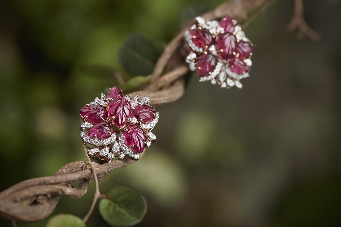 The Cardinal creeper earrings personify the determination and strength of a woman to rise against all odds. Intricately carved and accurately placed with precision, clusters of rubies and graded tourmalines are flanked by diamond-studded leaves and buds to bring into life the crimson flowers of the Cardinal Vine that constantly advance to greater heights.