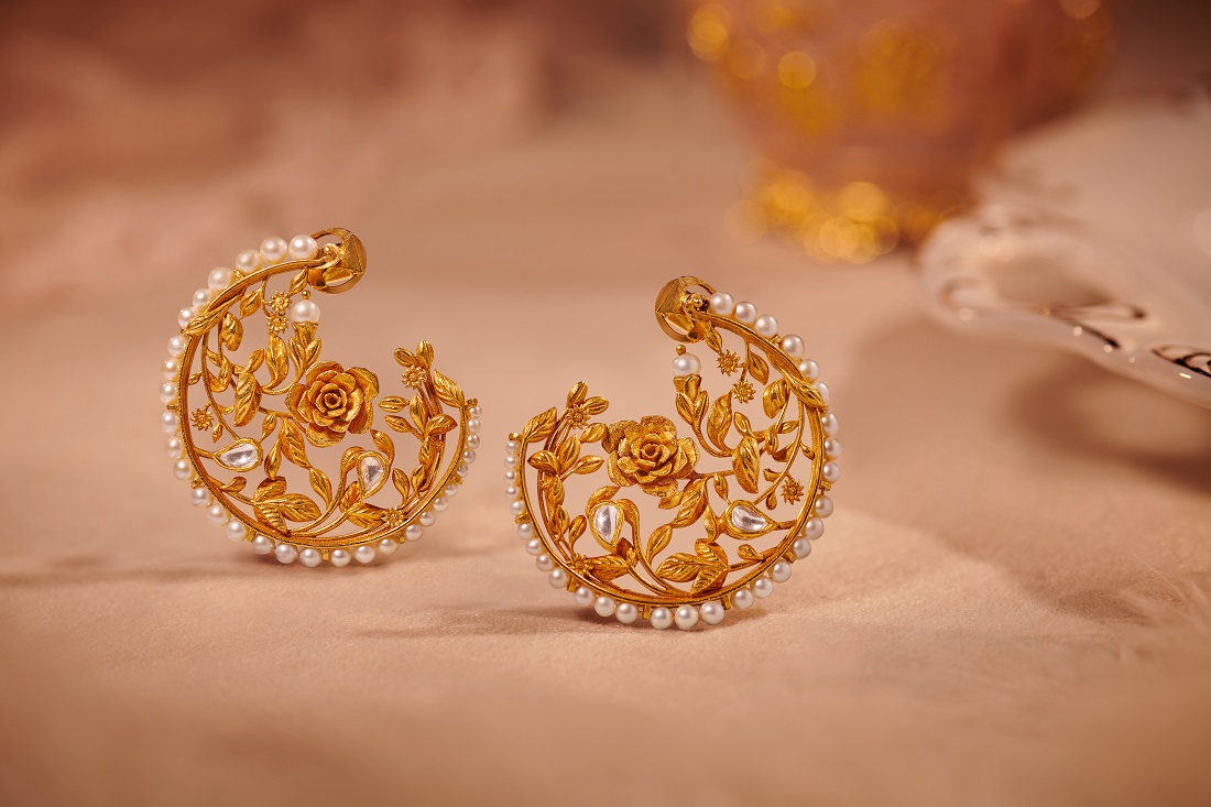 Handcrafted in gleaming gold, these elegant earrings with floral motifs capture the timeless splendor of the Baroque art. Giving traditional craft contemporary form, Zoya’s master craftsmen hand-carve each petal of the rose in an exquisite demonstration of intricate chittai work. Each petal is then soldered on individually to render a finished masterpiece worthy of being revered. Etched with two shining Polki diamonds and cream pearls are set in pirohi to accentuate its shape, Zoya’s Crescent Rose Earrings make a sensual and seductive statement with grace and fluidity.