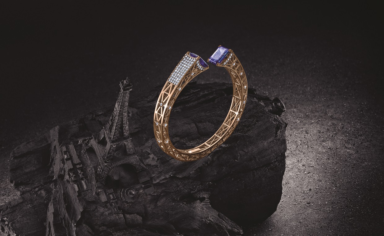 Encapsulating the myriad facets of Paris, the Musee du Luxe collection is a celebration of the enchanting allure of the city in precious gems. The Eiffel Tower serves as the design inspiration for this artistic masterpiece, bringing alive the romance that blooms in the heart of the one who adorns this. In this free-form, avant-garde interpretation, the complex lattice structure of the tower is brought alive with rose gold mesh and the night lights with brilliant-cut diamonds. Emerald-cut tanzanite stones in royal blue are meticulously set on a bed of diamonds on the chamfered end, complementing the rose gold perfectly. The tanzanite slopes with grace and delicacy on unequal prongs, a feat that renders this rare creation into a technical marvel, enabling the stones to disperse the light in a way that recreates the Parisian night sky bathed in a sea of twinkling stars, drawing admiration and conversation alike.