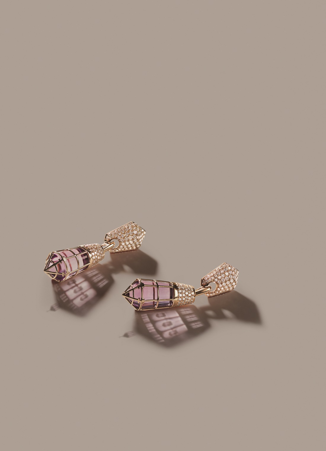 The stark symmetrical lines of the Florence Baptistry are intuitively celebrated in this pair of eponymous earrings. With these earrings, Zoya envisions the infamous architecture in the Florentine Romanesque style and reimagines it in contemporary accents. Flawless amethysts are sourced and then meticulously custom cut in a tapering octagon with careful grooving before being cushioned in the earring in a striking geometry of ink gold.
