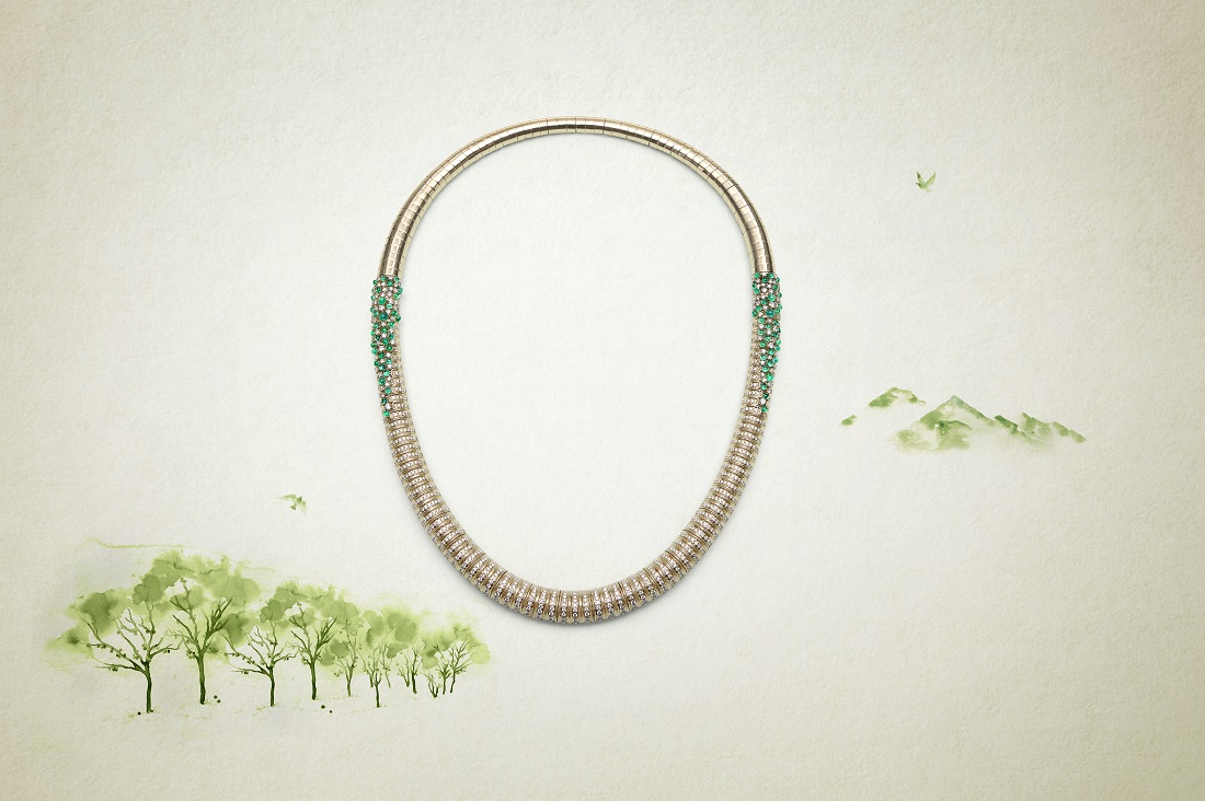 As winter fades in Kashmir, blooms of fruits and flora adorn the spring in this contemporary tubular necklace, a captivating arrangement of diamonds and cabochon emeralds reminiscent of the valley’s famous green apples. Celebrating the scenic beauty of unequalled splendour, the subtlety of the natural finish of white gold provides an appealing and distinctive bed for the diamonds. The skill and artistry of Zoya’s craft is evident in the fluidity of the necklace, made with extensive joinery, to sit comfortably on every neck.