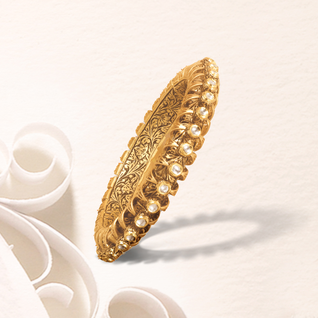 Inspired by the Sudarshan Chakra, this bangle by Zoya immortalizes the tales of Krsna in gold and diamonds. Raised elements depict the sharp edges of the chakra, with scintillating polki tips of uncut diamonds. Intricately engraved using the traditional art of partaj, this timeless masterpiece is meticulously chiselled with appeasing floral and leaf motifs for a graceful look. Extending into the smallest areas, the partaj is achieved by a combination of hand and machine carving giving this work of art, a graceful and elegant look.