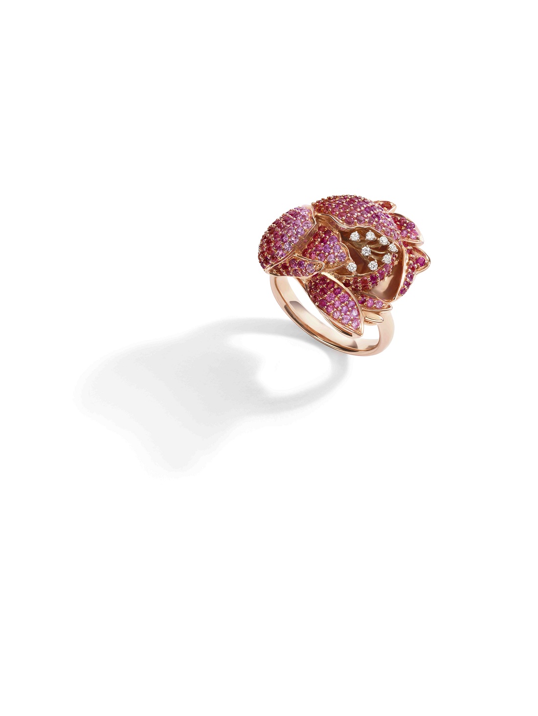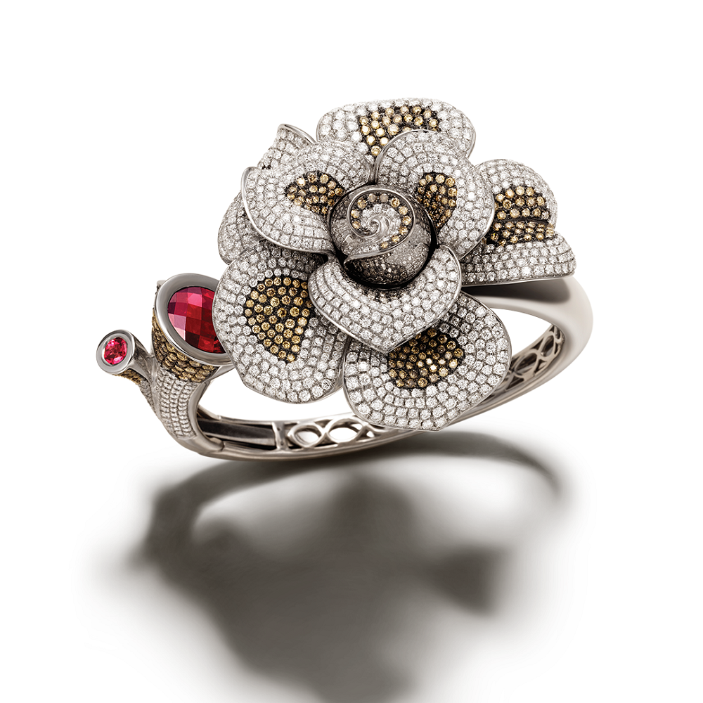 The Parisian spring comes alive in this magnificent ring, centred around a peony made of white gold and set in a gradient of diamonds and rubies using the rare and incredibly precise micro-pave technique. The peony symbolises prosperity and this ring is sure to transport you to a fairy tale wedding in Paris. Just as the peonies enhance the beauty of windowsills, this ring heightens the charm of the wearer.