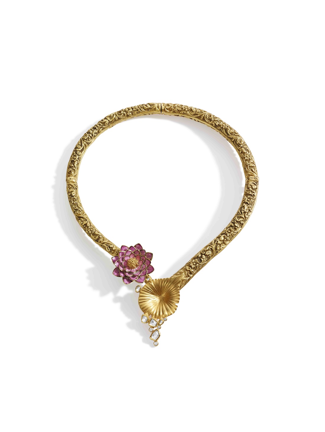 Standing on the banks of the Ganges, Zoya draws on inspirations from a city more ancient than time itself. The path of a majestic lotus is elaborately etched in gold nakashi, while uncut diamonds adorn its leaves. Zoya gives contemporary form to traditional craft, crafting this modern hasli in oxidised gold. Stunning lotuses draw one’s attention, with each petal meticulously enamelled in the dying art of Gulabi Meenakari, and then individually soldered with a thin border of gold to create this artistic masterpiece. The magnificent skill of Zoya’s artisans is also evident in the fine details of Varanasi Meena that is employed to craft the rose in pink and white enamel. A golden leaf crafted with chittai offers a delicate contrast to dewdrops of uncut diamond rolling off it.
