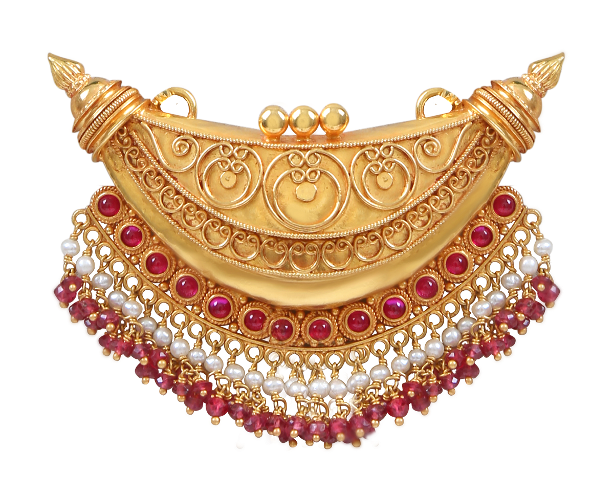 Maharashtrians’ fondness for pearls is not unknown and is vividly captured in the designs of chinchpeti (choker) and tanmani (short necklace). Their love for pearls is further manifested in the elaborate variety of naths that the culture boasts of.