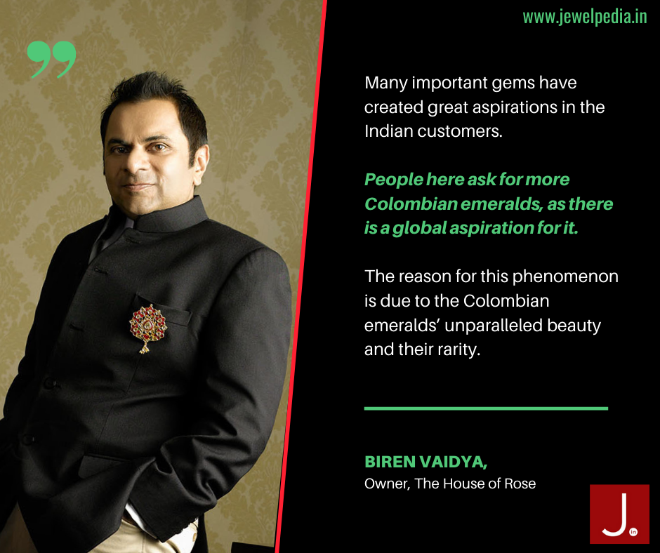 Biren Vaidya, the owner of The House of Rose, revealed that since 2008-09, Rose has been introducing Colombian emeralds to the HNI market and that the gem has been well received. “Many important gems have created great aspirations in the Indian customers. People here ask for more Colombian emeralds, as there is a global aspiration for it. The reason for this phenomenon is due to the Colombian emeralds’ unparalleled beauty and their rarity. In the last decade, the prices of Colombian emeralds have increased by five to six times. The Colombian emerald has a happy green colour and its greenish hue, along with many other colours, adds to the grandeur of our Indian wedding sets. As quality now wins over quantity, the well-informed younger generation, aware of their aspirations and in control of their purchases, is happy buying important jewels all by themselves,” he added.