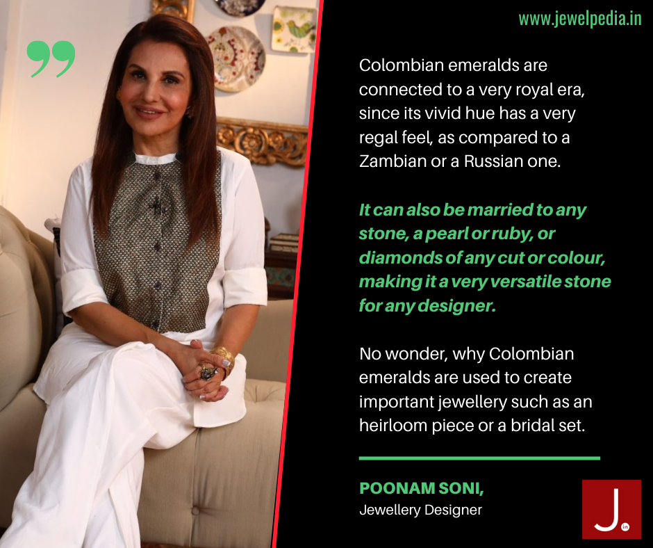 Renowned jewellery designer Poonam Soni stated that gemstones like Colombian emerald are gaining immense popularity in bridal trousseaus. “I personally use a lot of Colombian emeralds. I love cabochons the most and yes, the carved emeralds too. I have always felt that the Colombian emeralds are connected to a very royal era, since its vivid hue has a very regal feel, as compared to a Zambian or a Russian one. It can also be married to any stone, a pearl or ruby, or diamonds of any cut or colour, making it a very versatile stone for any designer. No wonder, why Colombian emeralds are used to create important jewellery such as an heirloom piece or a bridal set in which size, quality, and colour is given utmost importance,” she added.