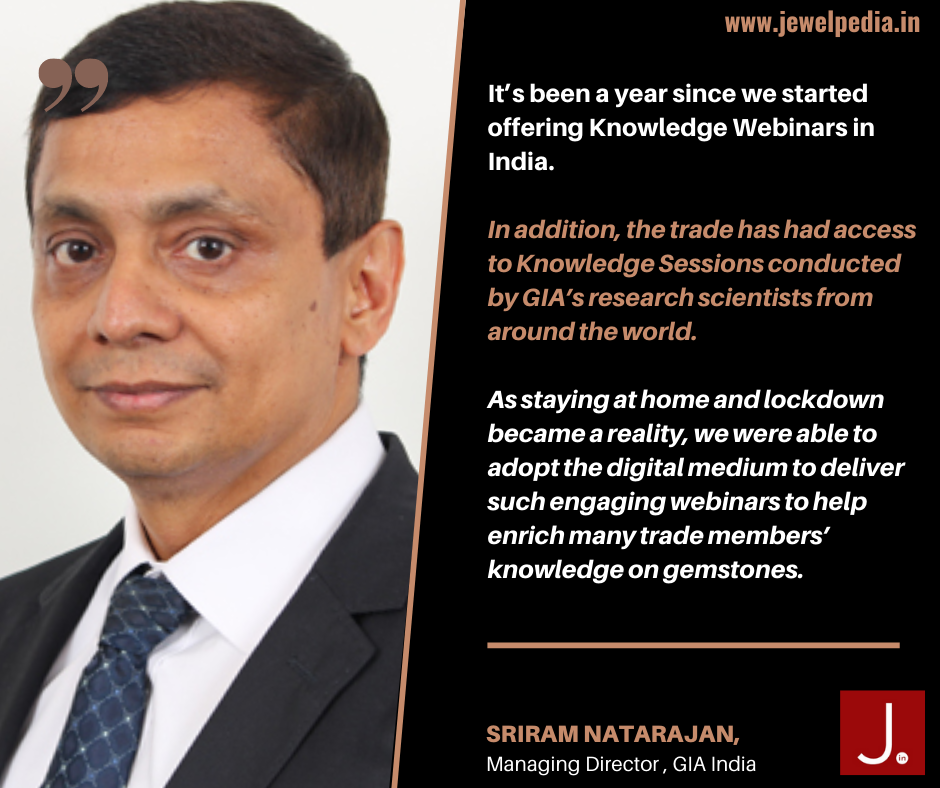 “It’s been a year since we started offering Knowledge Webinars in India. In addition, the trade has had access to Knowledge Sessions conducted by GIA’s research scientists from around the world. As staying at home and lockdown became a reality, we were able to adopt the digital medium to deliver such engaging webinars to help enrich many trade members’ knowledge on gemstones,” said Sriram Natarajan, Managing Director of GIA India. “I feel pleased to see the trade’s continued interest in learning and believe that GIA webinars could be of great help to them without disrupting their businesses. I’m confident that more and more professionals will take advantage of these Knowledge Webinars. GIA remains committed to sharing knowledge for the benefit of the trade, and ultimately, the consumer.”