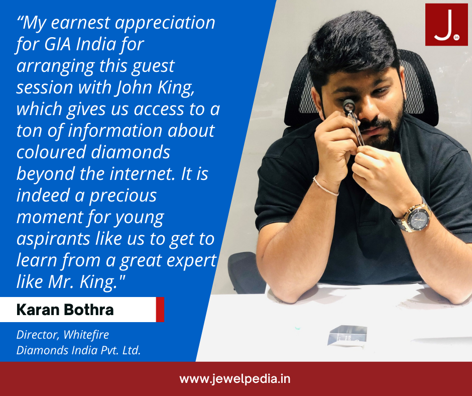 Another participant Karan Bothra, Director, Whitefire Diamonds India Pvt. Ltd., added, “My earnest appreciation for GIA India for arranging this guest session with John King, which gives us access to a ton of information about coloured diamonds beyond the internet. It is indeed a precious moment for young aspirants like us to get to learn from a great expert like Mr. King. The session was highly informative and talks such as these help us understand and learn about the important historical perspective of our trade. Our industry has incredible historical relevance and, as the future of the trade, we should take an active interest and help achieve many more milestones.”