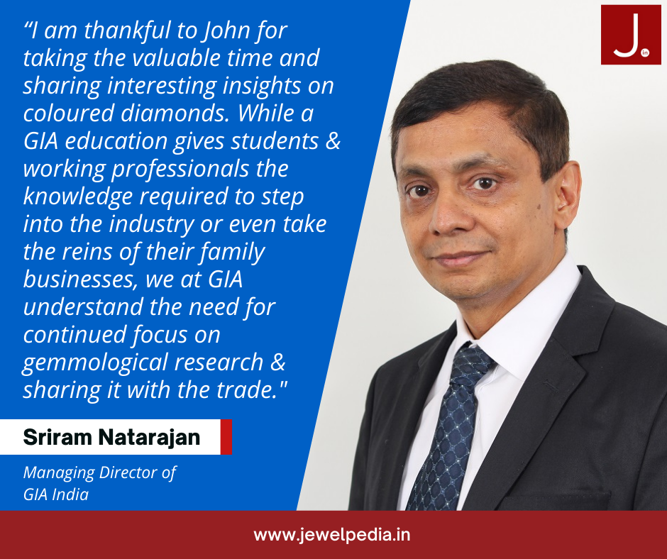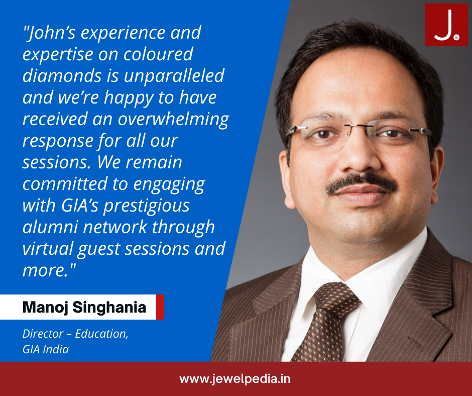 “It was a great session with John and I’m sure our alumni enjoyed it thoroughly,” Manoj Singhania, Director – Education, GIA India. “John’s experience and expertise on coloured diamonds is unparalleled and we’re happy to have received an overwhelming response for all our sessions. We remain committed to engaging with GIA’s prestigious alumni network through virtual guest sessions and more.”
