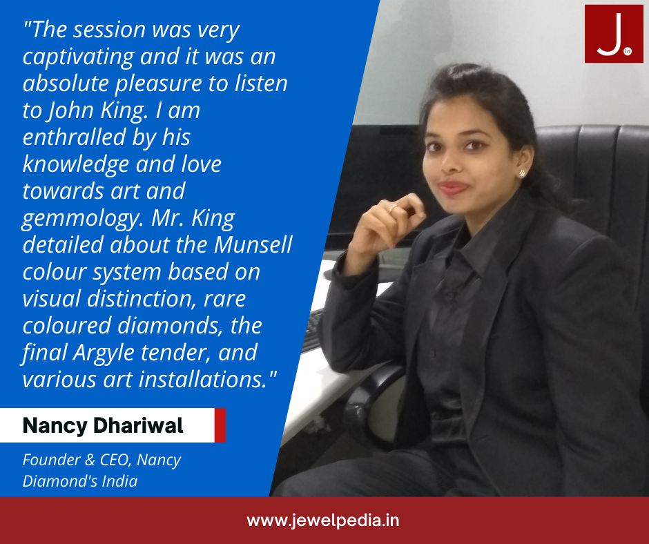 One of the participants from the session, Nancy Dhariwal, Founder & CEO, Nancy Diamond’s India, and a GIA Diamonds Graduate said, “The session was very captivating and it was an absolute pleasure to listen to John King. I am enthralled by his knowledge and love towards art and gemmology. Mr. King detailed about the Munsell colour system based on visual distinction, rare coloured diamonds, the final Argyle tender, and various art installations. I am fortunate to have been a part of this session and grateful to GIA India for this wonderful opportunity.”