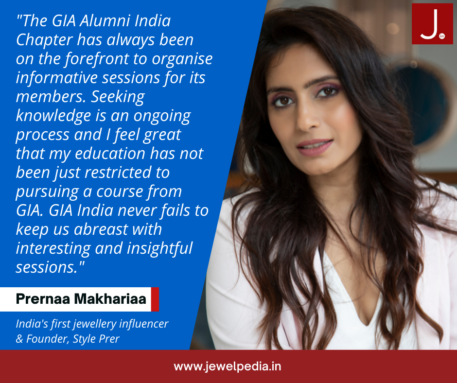 Prernaa Makhariaa, India’s first jewellery influencer and Founder at Style Prer by Prernaa Makhariaa, shared her experience, “The GIA Alumni India Chapter has always been on the forefront to organise informative sessions for its members. Seeking knowledge is an ongoing process and I feel great that my education has not been just restricted to pursuing a course from GIA. GIA India never fails to keep us abreast with interesting and insightful sessions. There are many facts and information which are not known to us and such sessions help us to enrich our knowledge. I am glad to be a part of the session by John King and grateful to GIA India for this initiative.”