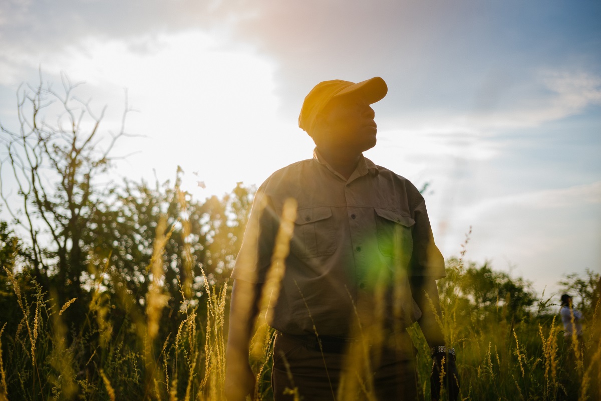 Park ranger walking through long grass at Venetia Limpopo Nature Reserve, part of the De Beers Group Diamond Route