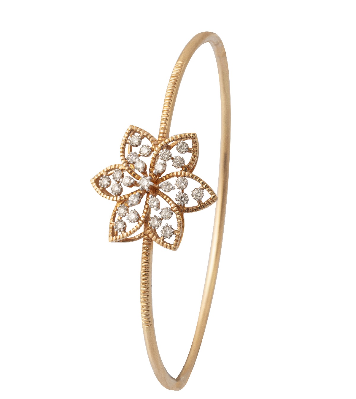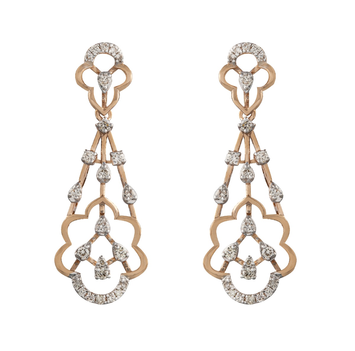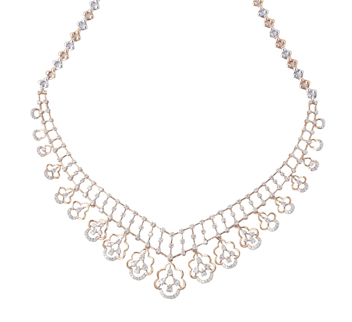 In this awe-inspiring collection, the classic necklace set in pure rose gold, with dew droplets laden with diamonds, is sure to add an ethereal vibe. Droplets of round-cut white diamonds with golden embellishments add a finishing touch of magnificence to each creation. The cluster setting of brilliant and round-cut white diamonds set in glistening gold shines bright across the entire range.