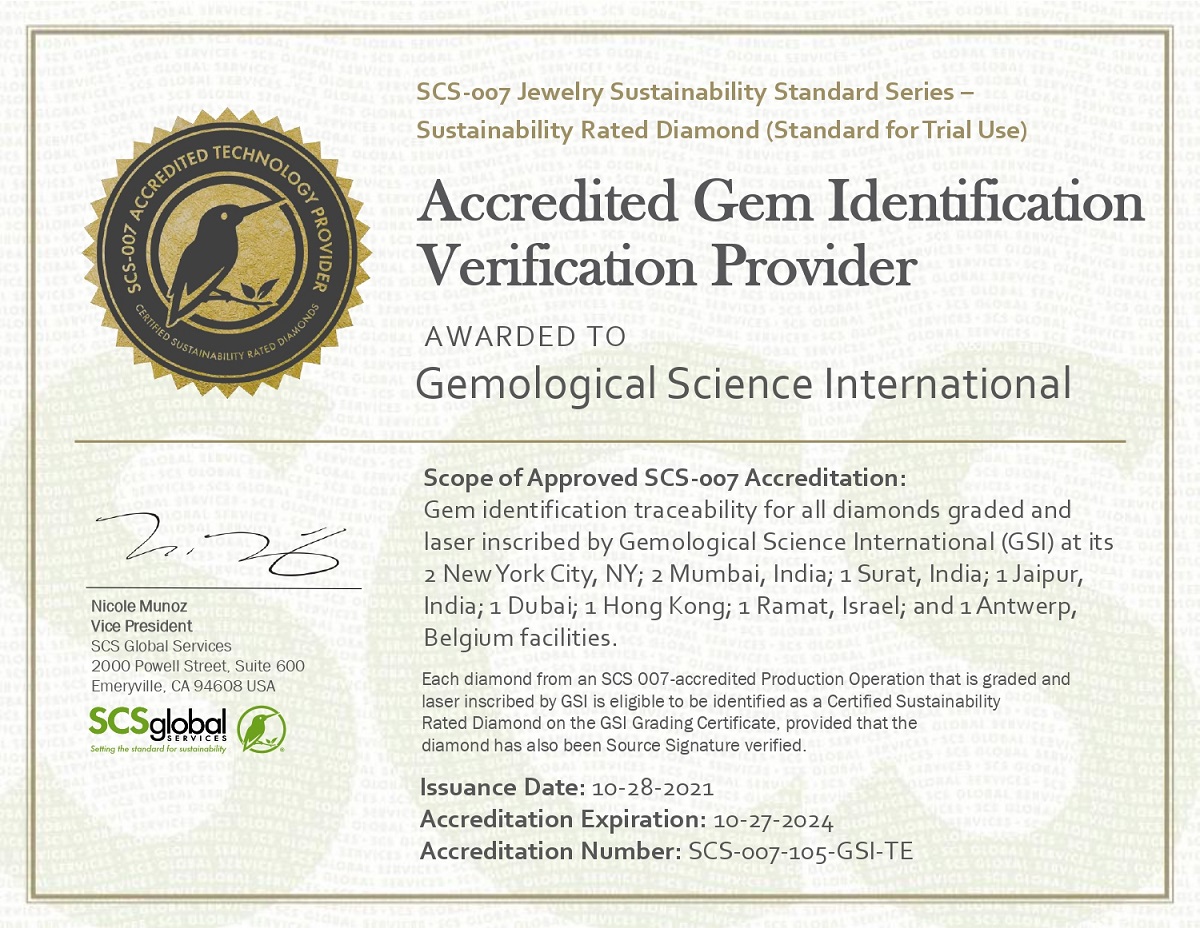 In its Gem Identification Verification Provider Accreditation document, SCS confirmed that GSI’s global laboratories meet the accreditation criteria as Gem Identification Facilities required for Origin Traceability Assurance under the SCS-007 Jewelry Sustainability Standard – Sustainability Rated Diamonds. Each diamond from an SCS 007 accredited Production Operation that is graded and laser inscribed by GSI is eligible to be identified as a Certified Sustainability Rated Diamond on the GSI Grading Certificate, provided that the diamond has also been Source Signature verified.