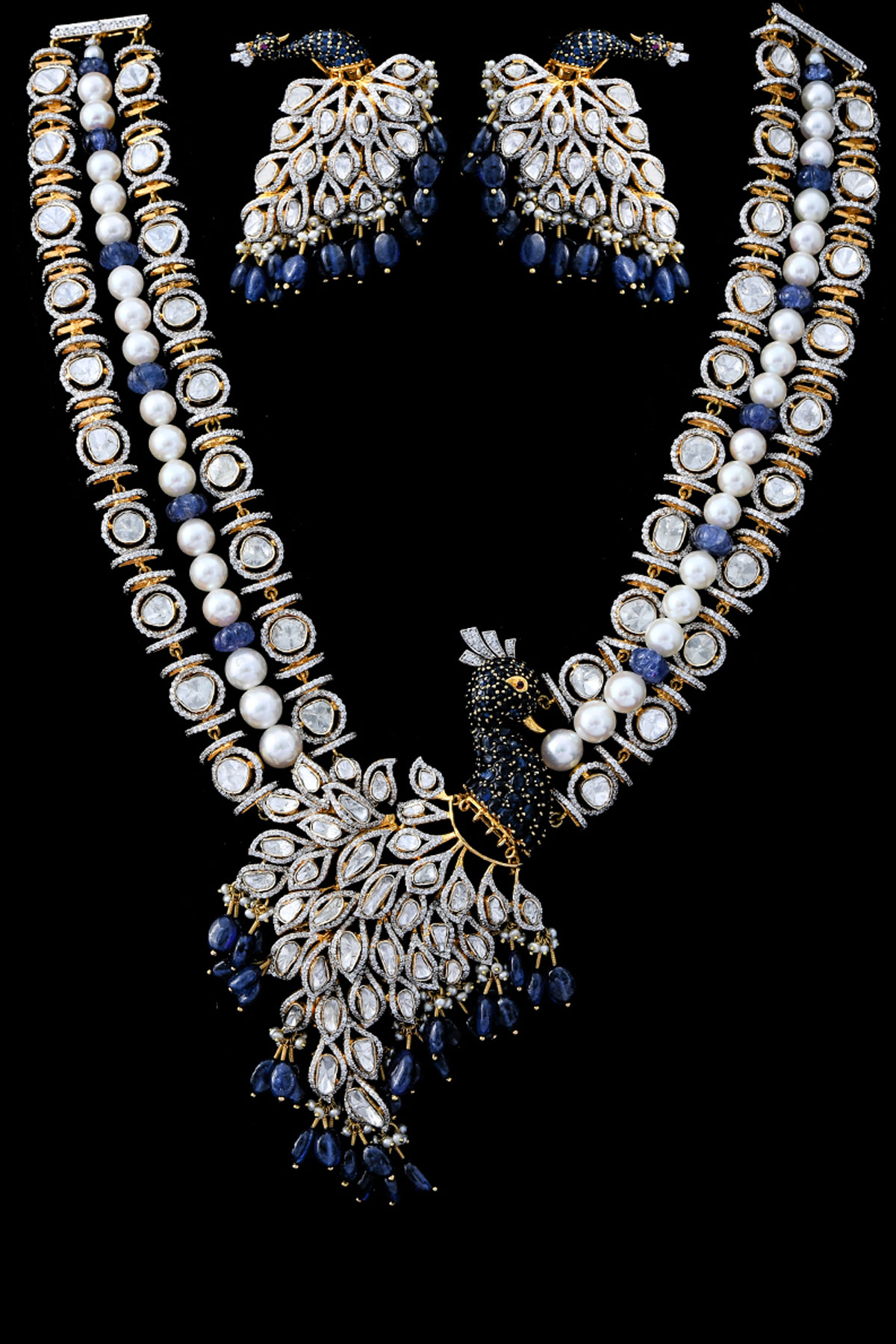 Highlighting the stunning peacock-themed pearl neckpiece that comes with earrings available for winter buyers. The designs will be exclusively available online along with a suitable variety of jewellery pieces for the winter season. Customized designs are also available on special requests.