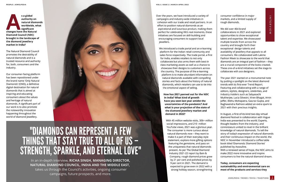 In an in-depth interview with Jewelpedia, Richa Singh, Managing Director, Natural Diamond Council, India and The Middle East, takes us through the Council’s activities, ongoing consumer campaigns, future prospects, and more.