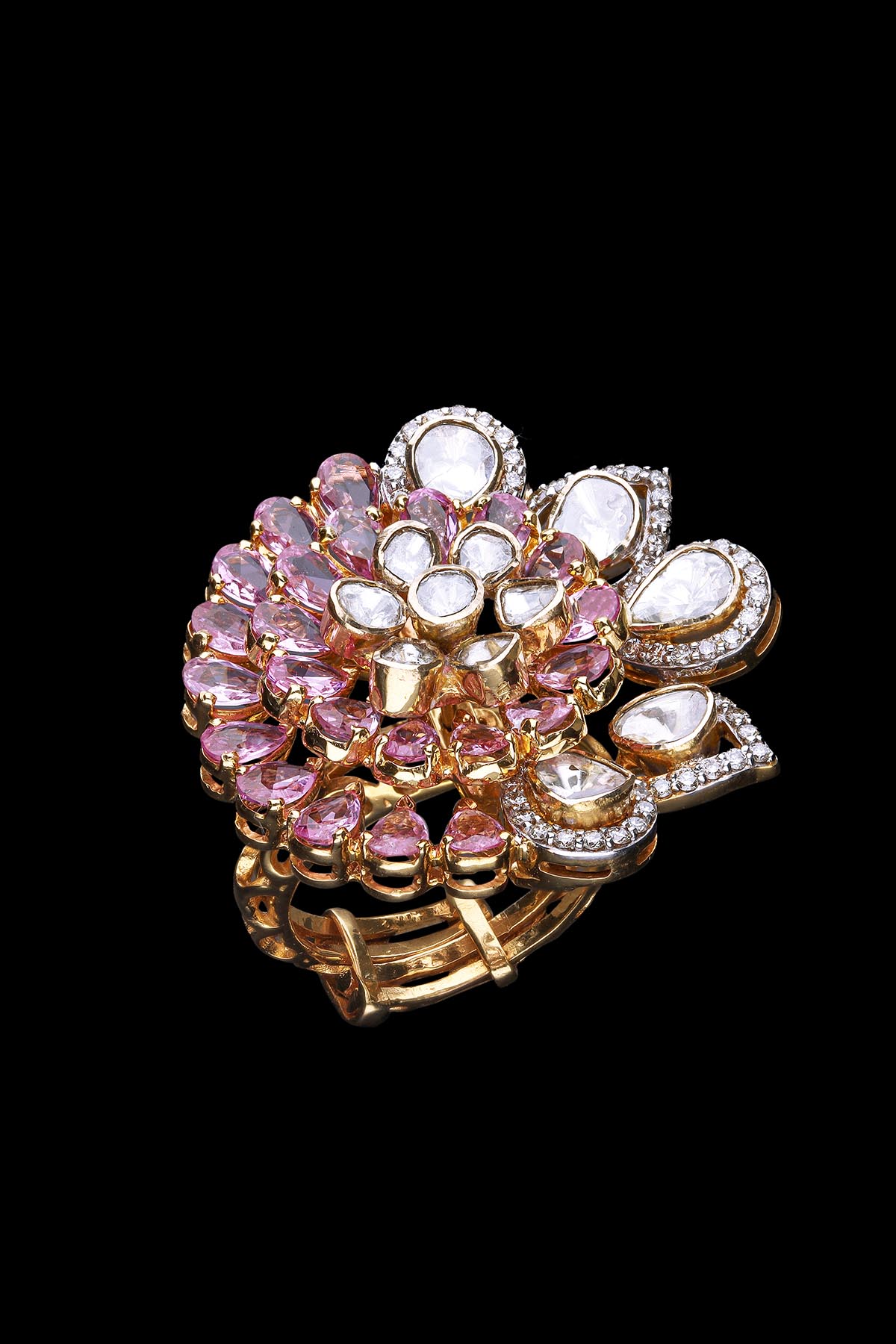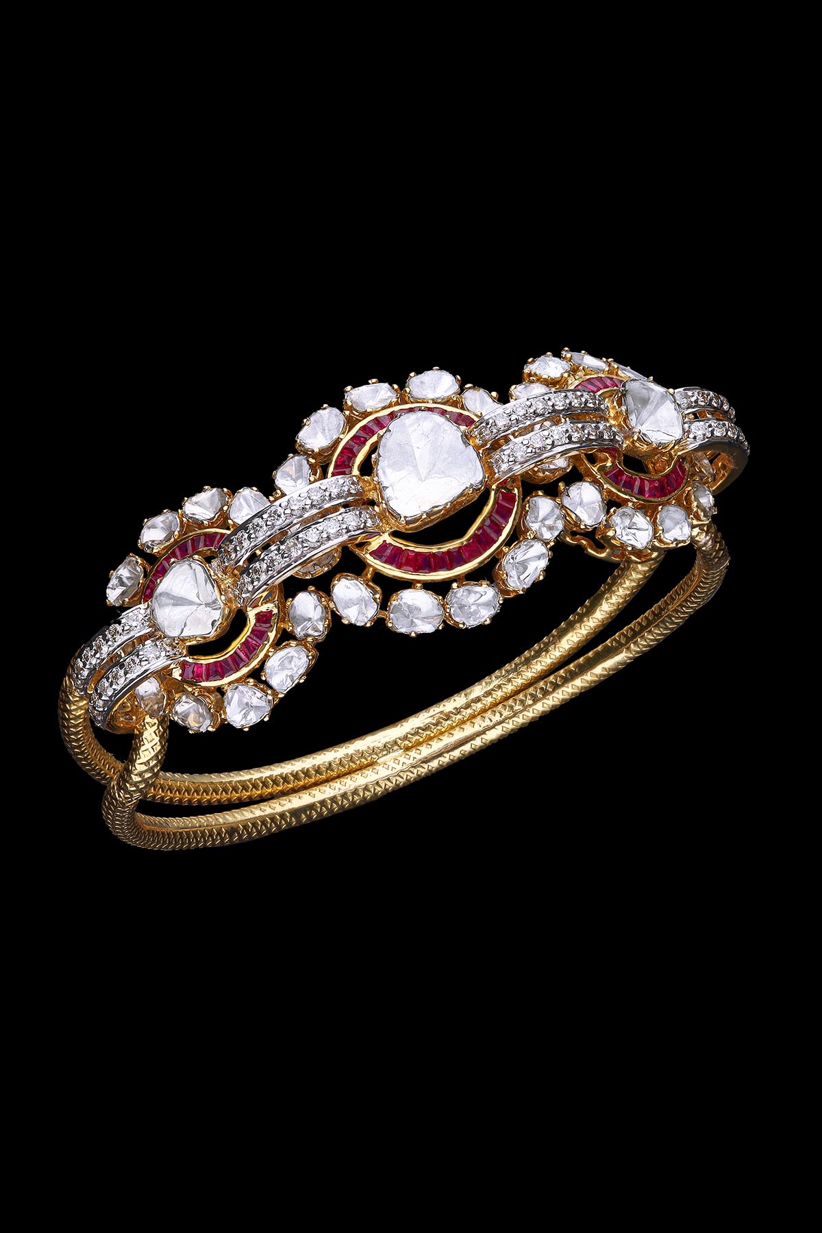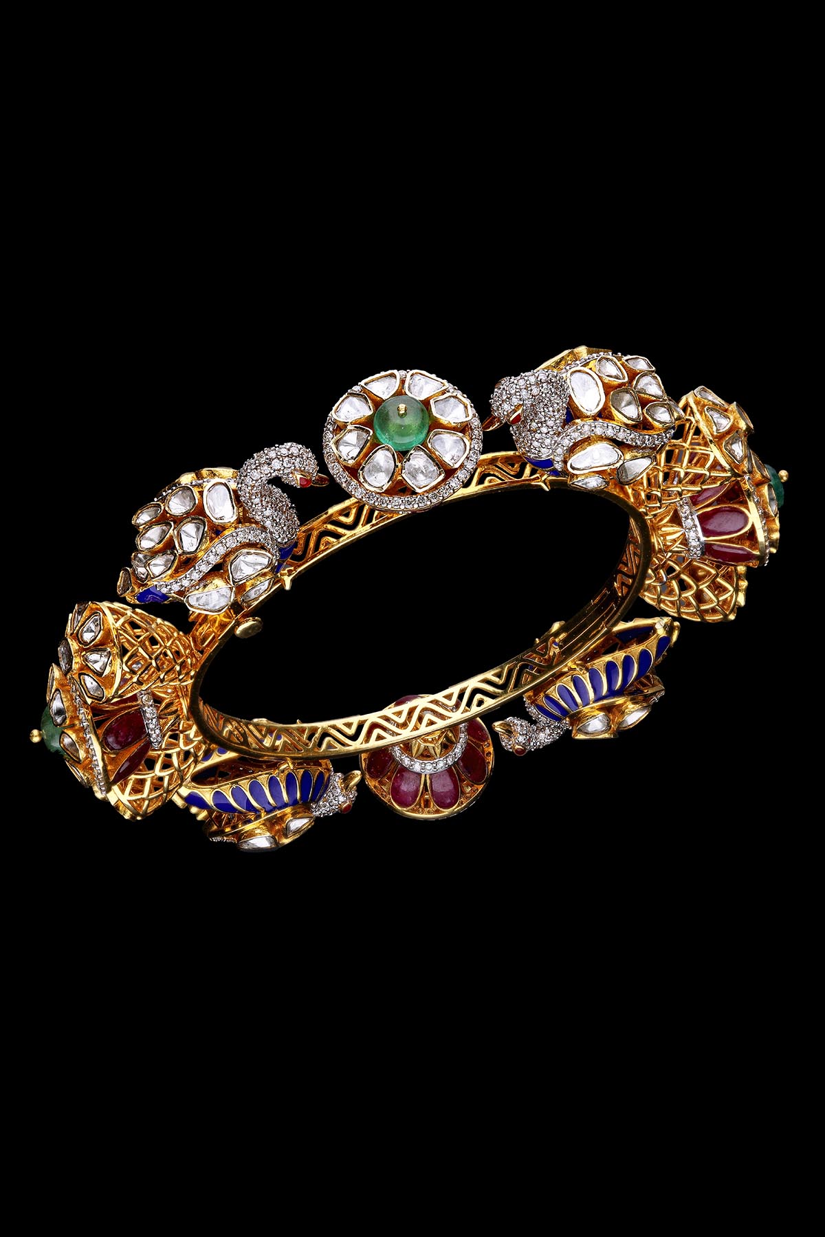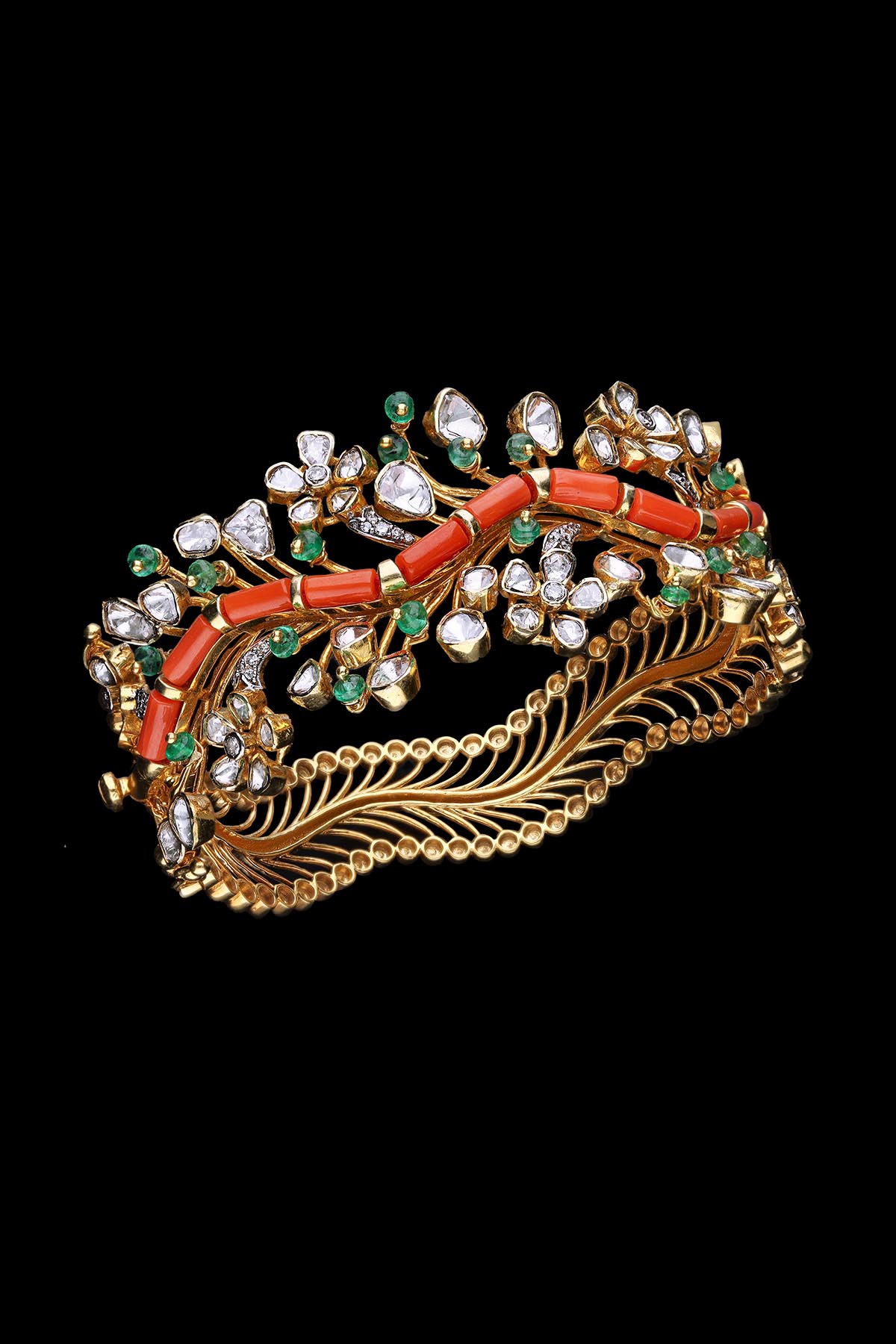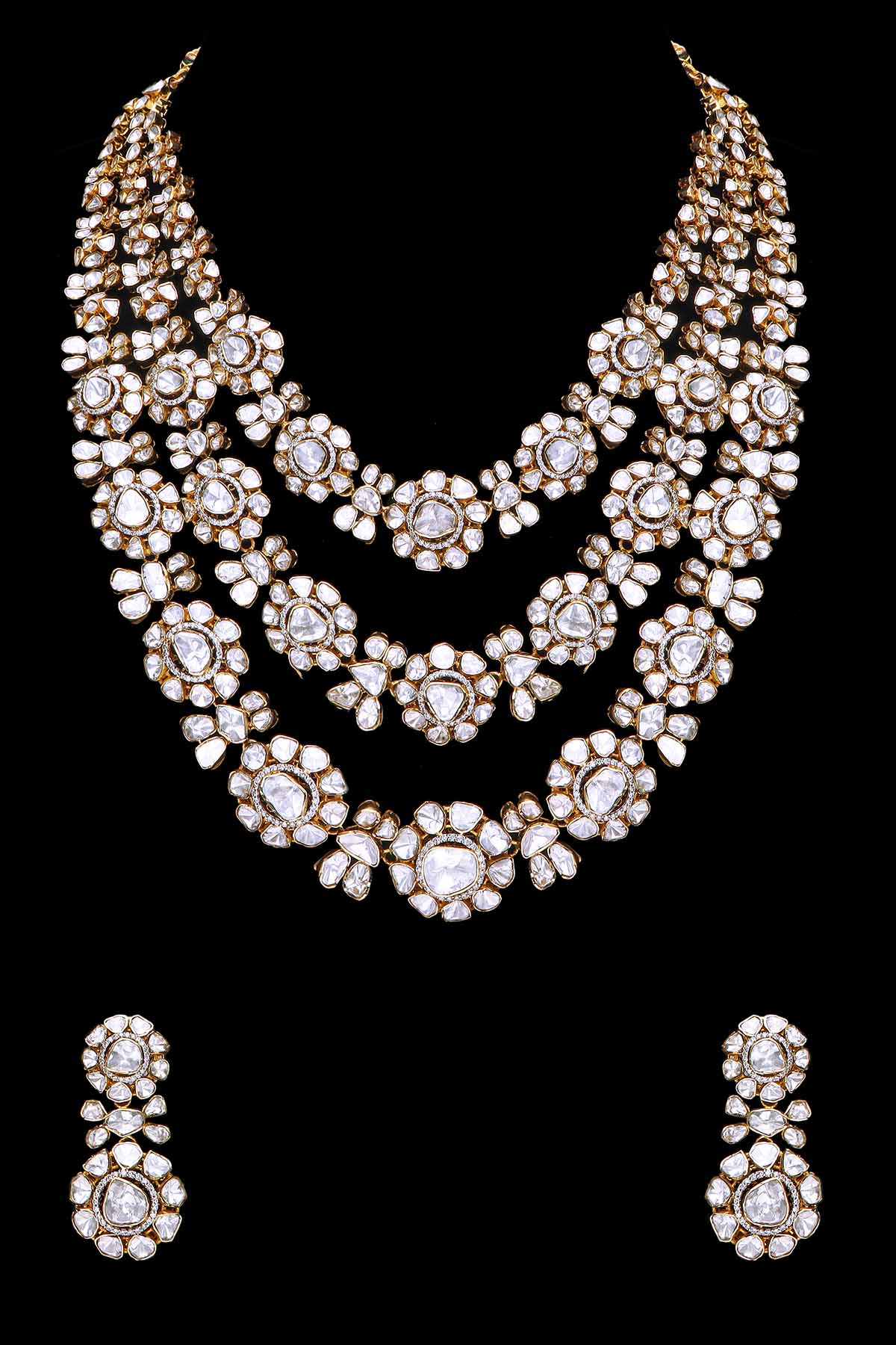 The collection is a full-fledge package for brides which comprises jewellery pieces like bridal neckpieces with heavy earrings, rings and bangles which never go off the trend. The jewellery is handcrafted and designed by skilled artisans and designers, especially for big events and celebrations. Polki is the purest form of diamond, which is used while crafting the jewellery along with round brilliant cut diamonds, emerald mani, carved emerald, emerald beads, emerald cabochon, pink sapphire beads & south sea pearls. The jewellery is made of 22kt and 18kt gold with finely finished designs.
