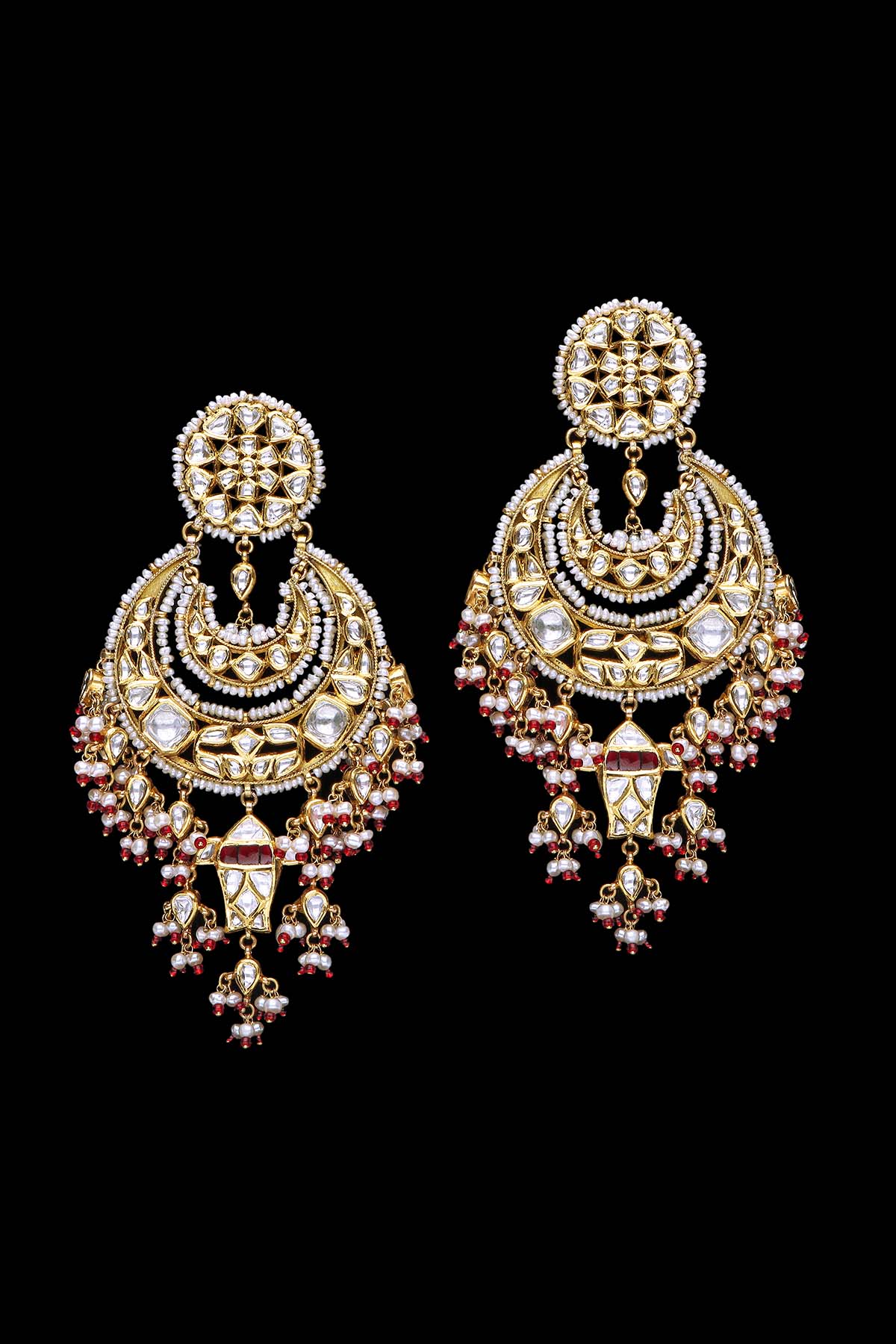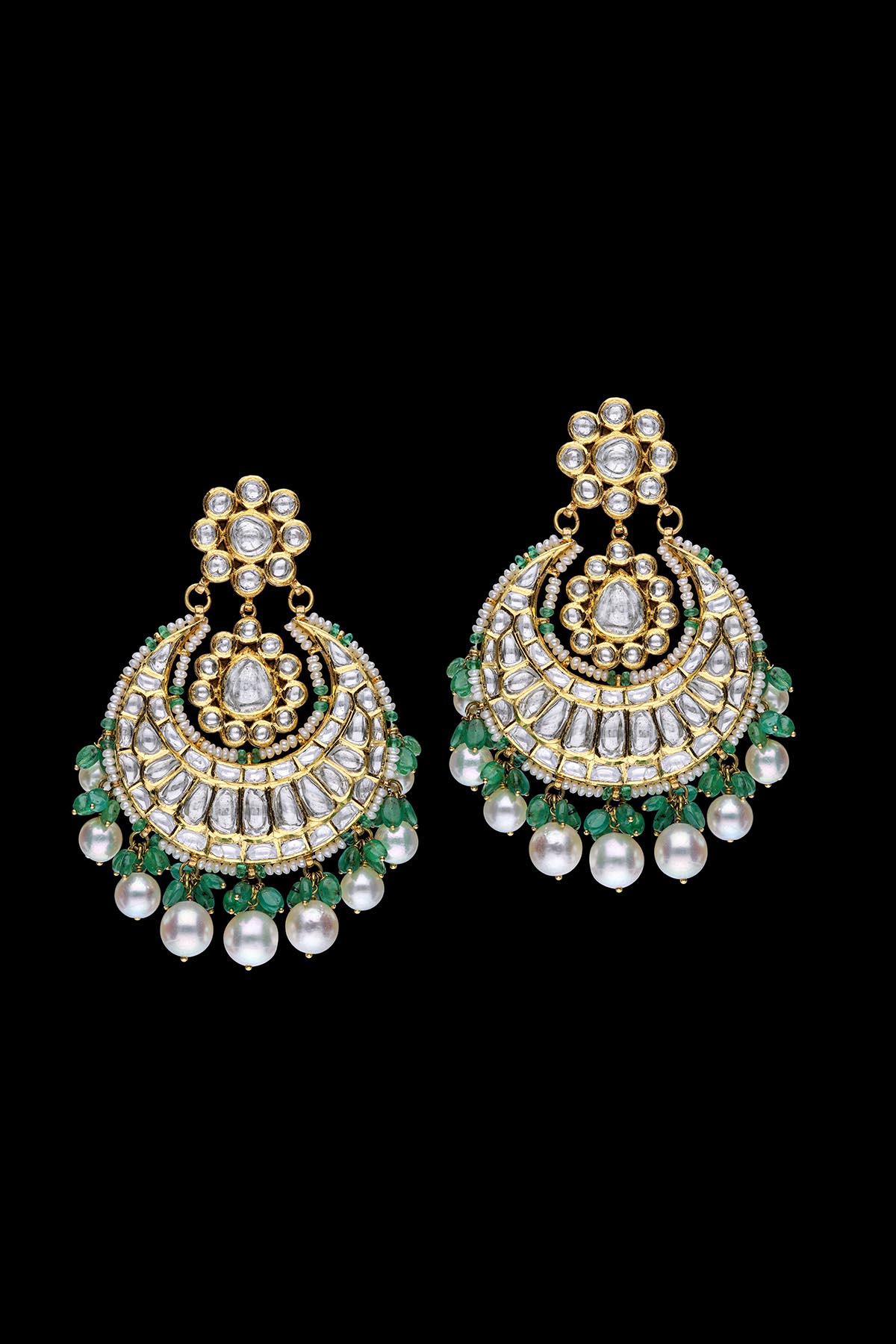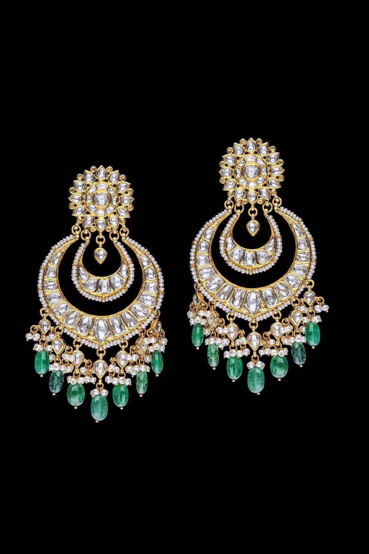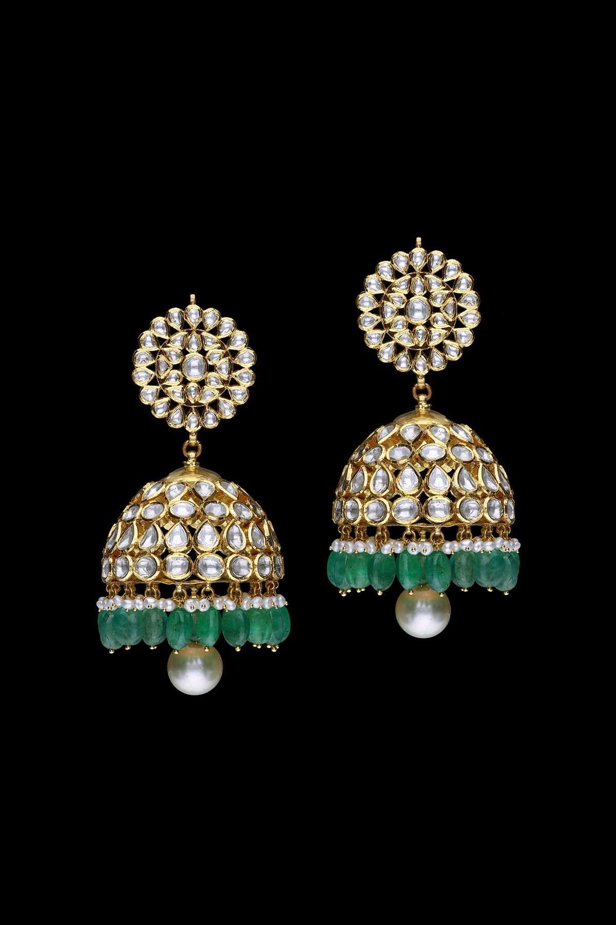 The collection comprises 22k gold earrings embellished with Polki (Uncut Diamonds), Emerald Beads, Emerald Mani, Ruby Beads, Cultured Pearls and South Sea Pearls. The Polki earrings are ready-to-go pieces as they are complete in themselves and require no other accessory to add to the look. They can be carried with traditional as well as modern attires as the opulence of the jewellery will compliment every apparel in its best form.